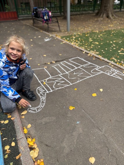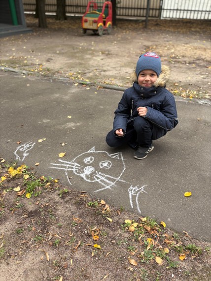 Вооружившись разноцветными мелками, дети активно принялись за работу. В одно мгновение детская площадка превратилась в большой коллаж из ярких детских рисунков.
